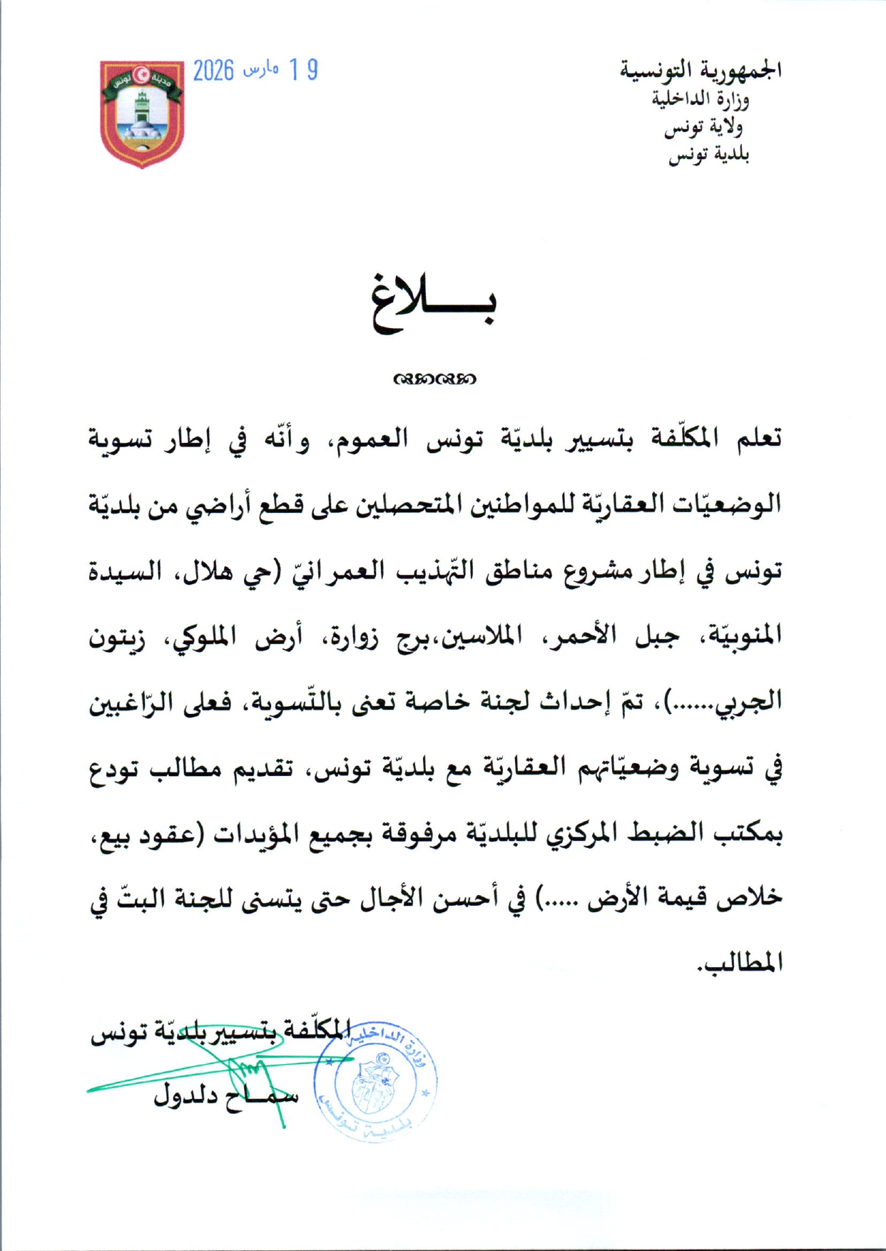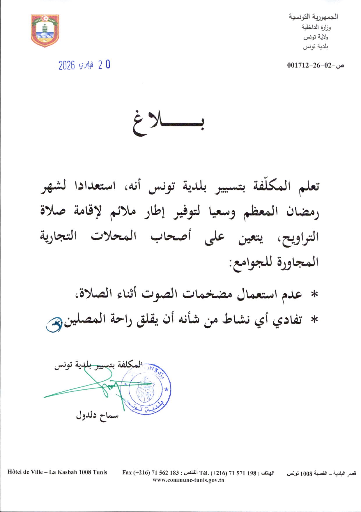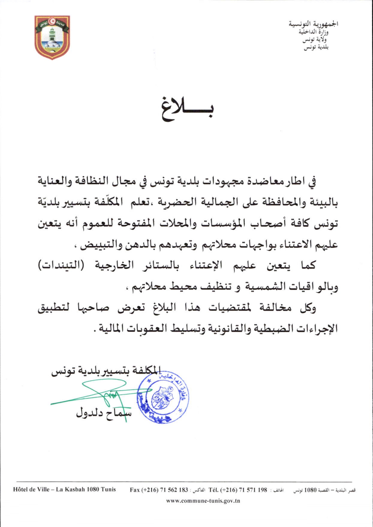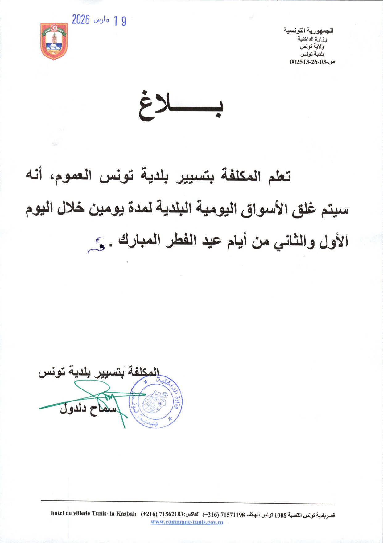 مكن تقديم أي شكاوى على www.commune-tunis.gov.tn ، عبر النموذج “شكوى ” (في صفحات الموقع).