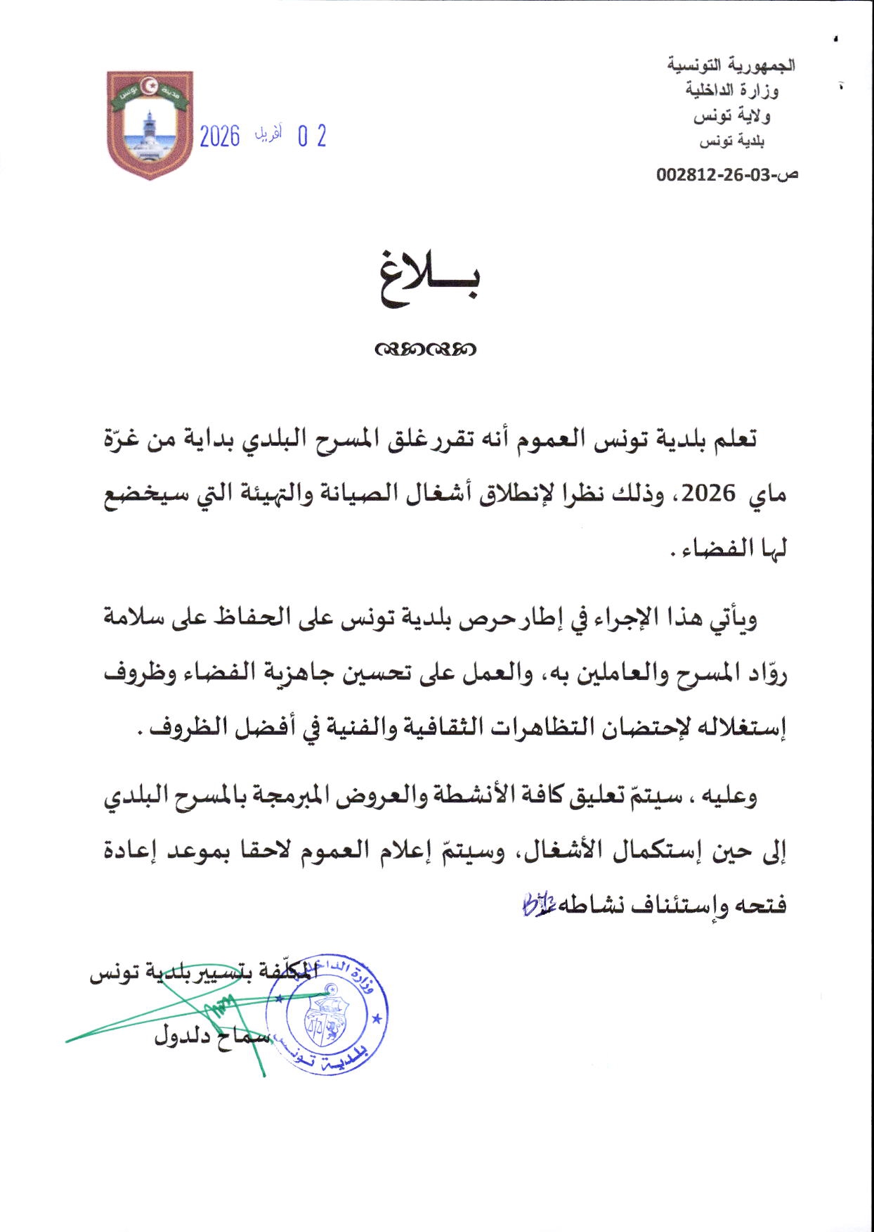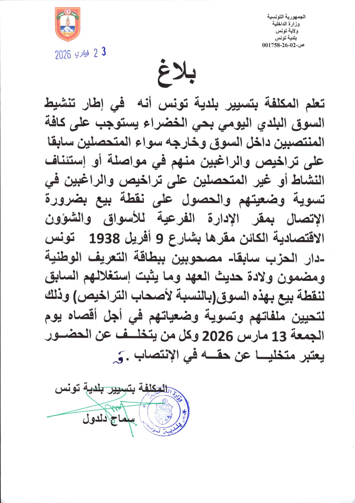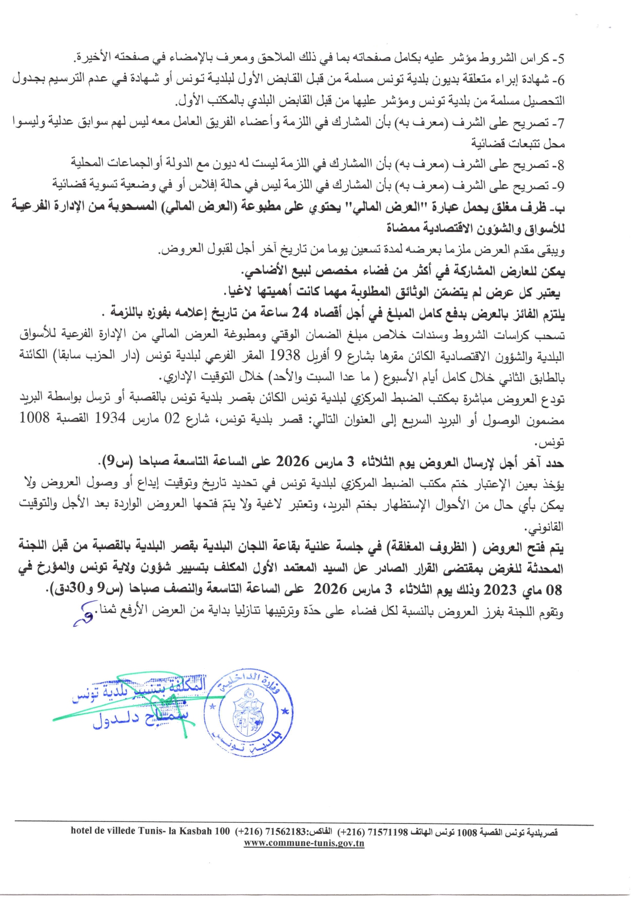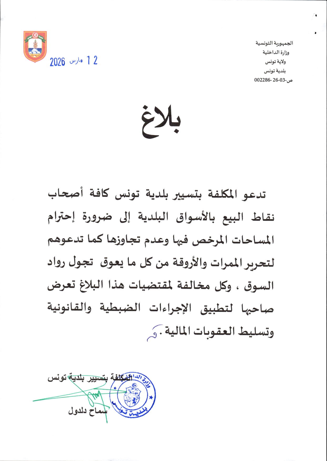 لا يمكن اعتبار بلدية مدينة تونس مسؤولة عن أي أضرار، مادية أو غير مادية، تسببت في متصفحي الإنترنت، أجهزة الكمبيوتر الخاصة بهم والبيانات المخزنة، أو أي تبعات مباشرة أو غير مباشرة قد تترتب على ذلك.